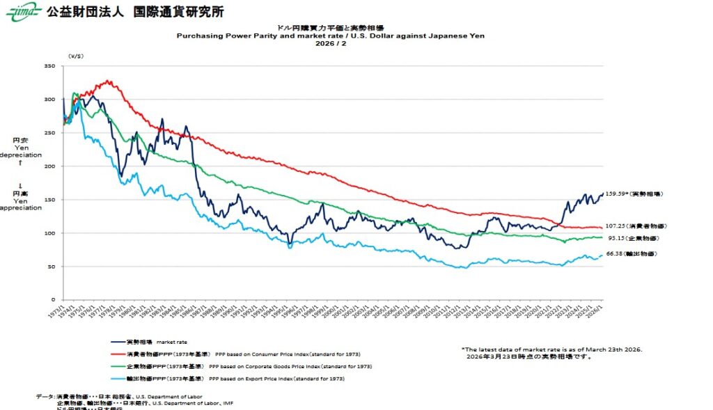 BigMac指数(=各国・地域におけるビッグマックの平均価格を比較することで、為替レートや物価水準、購買力といった経済状況の比較や把握をしやすくするための指数)での円のドルの過小評価の割合は、未だに拡大傾向が続いています。