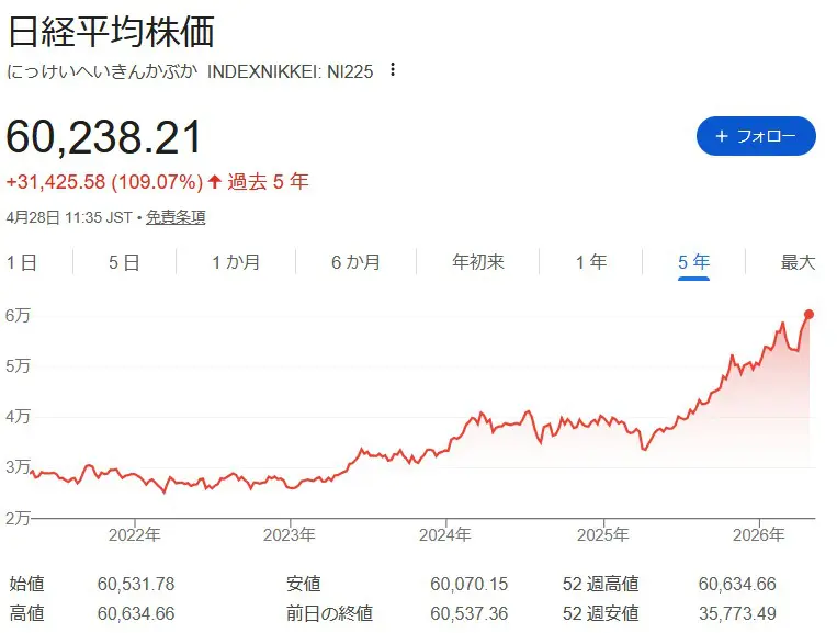 低調な為替相場とは裏腹に、株価はここ1年堅調です。1年前は、1989年のバブル最高値38,915.87円を二十数年ぶりに更新して高揚感が残っていましたが、そこから僅か1年で約+40%、先日はなんと終値で6万円台に到達しています。