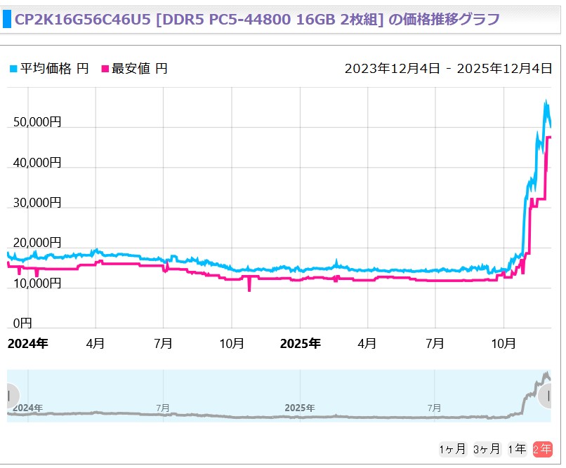 仕手株の価格推移のようなチャートですが、今の自作PCでは標準的な32GBメモリ価格です。わずか1ヶ月ちょっとの間に、3倍ほども高騰しています。
