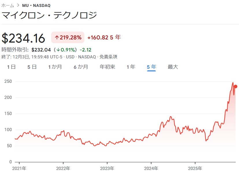 やはり直近急騰しています。2025年年初にこうした動きを予見して、投資できていたら、幸せな年末を迎えていそうですが、ブログ主には無理です。GPUのnvidiaは比較的早くから着目されつつせけていますが、こうした動きがいずれDRAMにまで波及すると予見できた一般投資家はいるのでしょうか。PC自作する投資家の中では極々ニッチな層ですら厳しいかと。