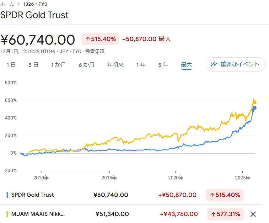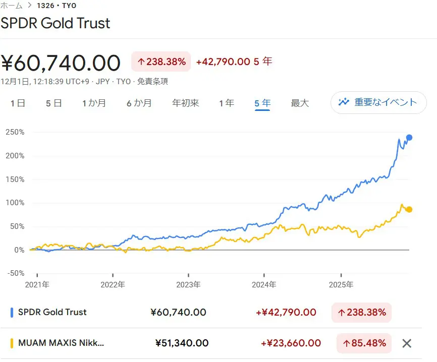 東証上場ETFのSPDRゴールドシェア(1326)とMAXIS日経平均(1346)を用います。2024年8月と、2025年5月、そして現在の2025年12月時点で比較してみます。
