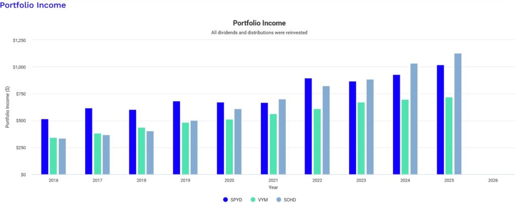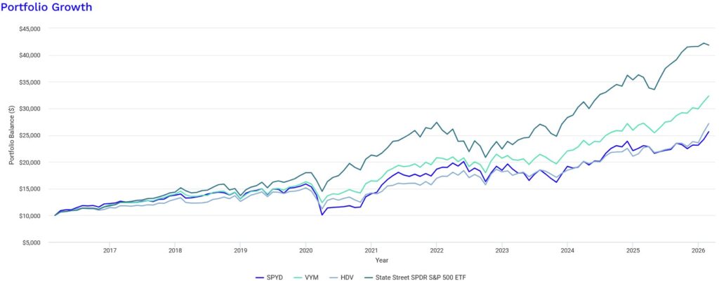 分配金再投資した場合のかつては高配当御三家とも呼ばれたSPYD,VYM,HDVのチャートです(Portfoliovisualizerにてブログ主作成)。