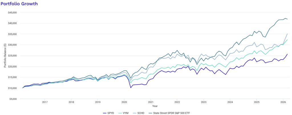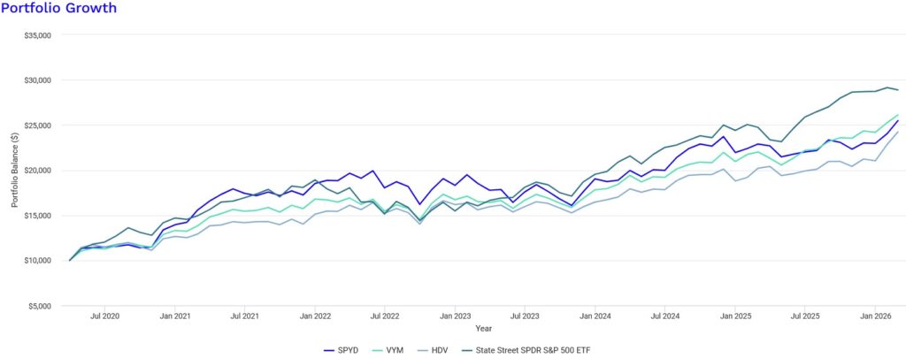 切り取る期間により全く異なって見えるもののS&P500>VYM>SPYD≒HDVの傾向は2026年に入っても、従前と変化はありません。