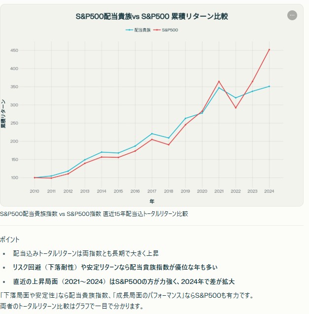 「売上高や営業利益が拡大している企業」とイコールではないですが、財務健全で「売上高や営業利益が拡大している企業」だからできる場合が多い「連続増配」25年以上、かつS&P500構成企業約70社で均等に構成される米国の「S&P 500配当貴族指数」があります。