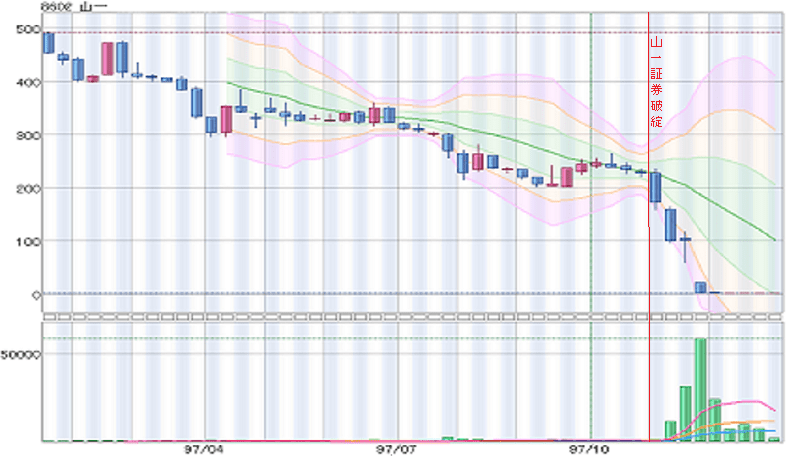 チャートは他所様のブログより拝借しています。1997年11月に簿外債務に起因して自主廃業を公表した当時4大証券の一角日興証券の廃業前1年のチャートです。下落基調にありましたが、知名度抜群の超大企業が破綻するとは誰しも思わないのが自然です。もし株主であったとして、事後的に株価推移を見ても、直近高値から-50%ぐらいの水準で、破綻1年前の間に先を見越して損切りすることは相当困難でしょう。