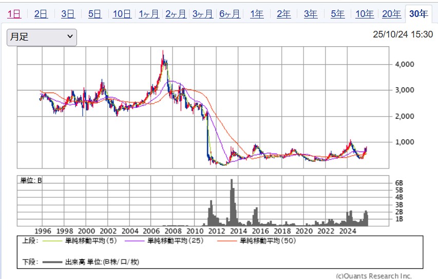 2012年に粉飾決算が発覚した当社は、株価の大幅下落に見舞われました。しかし、その後の推移はこの通り。山一證券の例などが思い浮かべば損切に走っていたかもしれませんが、一般人がその後の回復まで、的確に予想することはこれまた困難です。