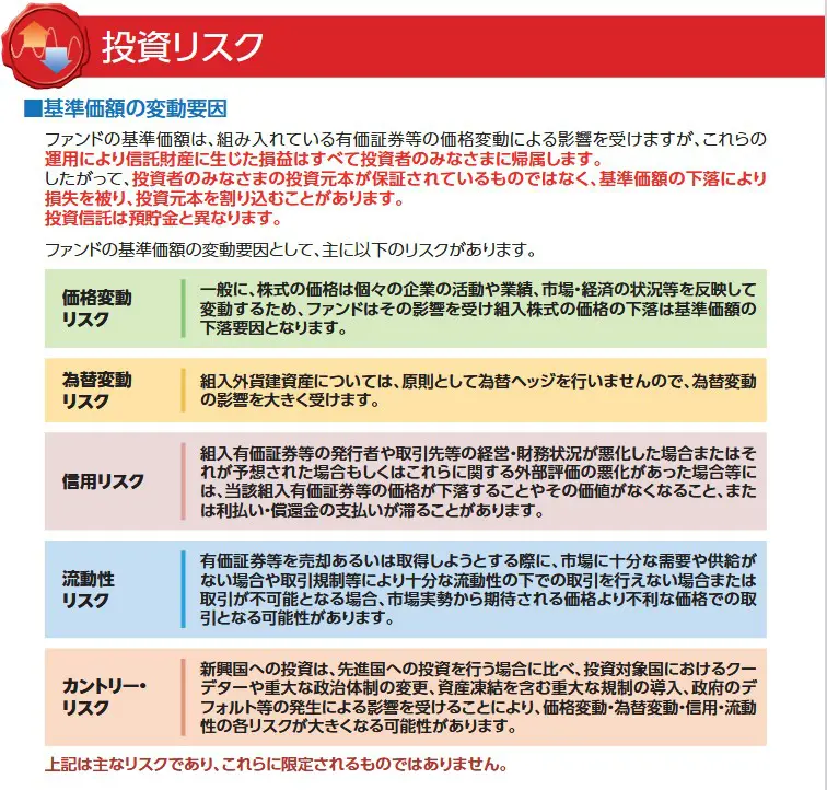 全世界株式インデックス投資信託の交付目論見書には、最初の方で「為替変動リスク」含むリスクを目立つように説明しています。