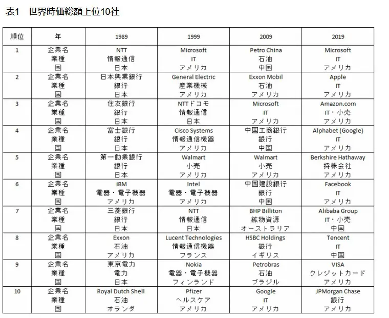 当時の1999年世界株式時価総額上位ランキングをみてみると、1989年のバブル絶頂期から10年経過し失われた十年と言われていた頃ですが、まだNTT,NTTドコモが世界TOP10内、GEやNOKIAなど懐かしい面々もみられていました。