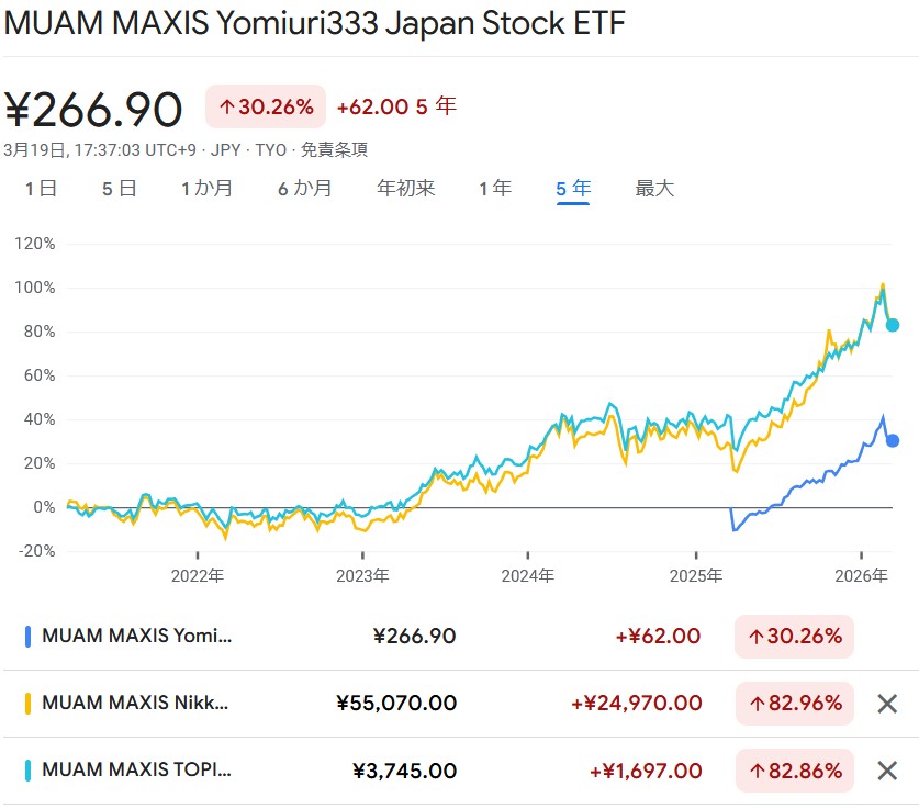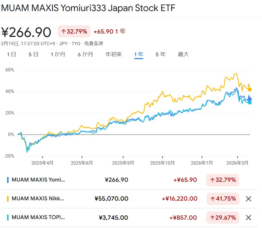 正直なところ、ブログ主は、定点観測用にMAXIS読売333日本株上場投信(348A)を20口購入価格3,540円分だけ保有しているものの、あまり気に留めていませんでした。しかし、たまたま、老舗のたわらシリーズの投資信託に新規設定される記事をみて、1年間の他の日本株指数(TOPIX,日経平均)と値動きの比較をしてみることにしました。