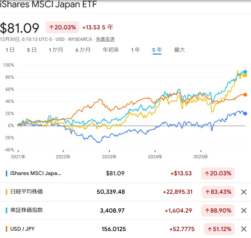円建て指数のスケールがおかしいようにみえるものの、それを差しひいてもドルベースのEWJと、円貨である日経平均、TOPIXが、全く別物のようにみえます。投資対象はほぼ同じ故、表示通貨だけでこれほど違って見えるのは驚きでしかありません。