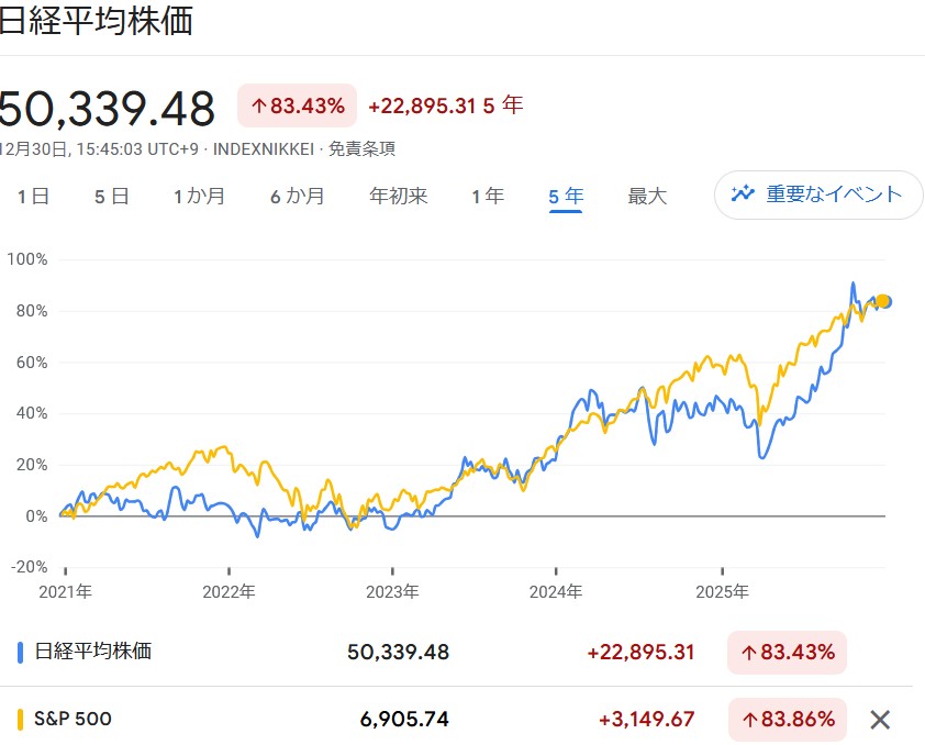 昨年度末に5万円台を維持し、年間で1万円超上昇した日経平均株価。年末の振り返りを作成していて、S&P500や全世界株式含めて怖くなるほどの普通ではありえない好調さを感じて、本当にこんなにパフォーマンスがいいのか客観的な立ち位置を確認しておきたくなり確認します。