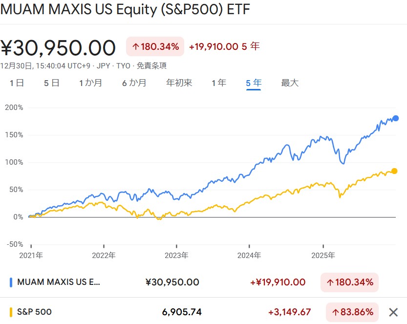 最後についでに東証上場のMAXIS米国株(S&P500)ETF(2558)を用いて、円ベースでS&P500に投資した場合とドルベースの本家指数を比較してみます。